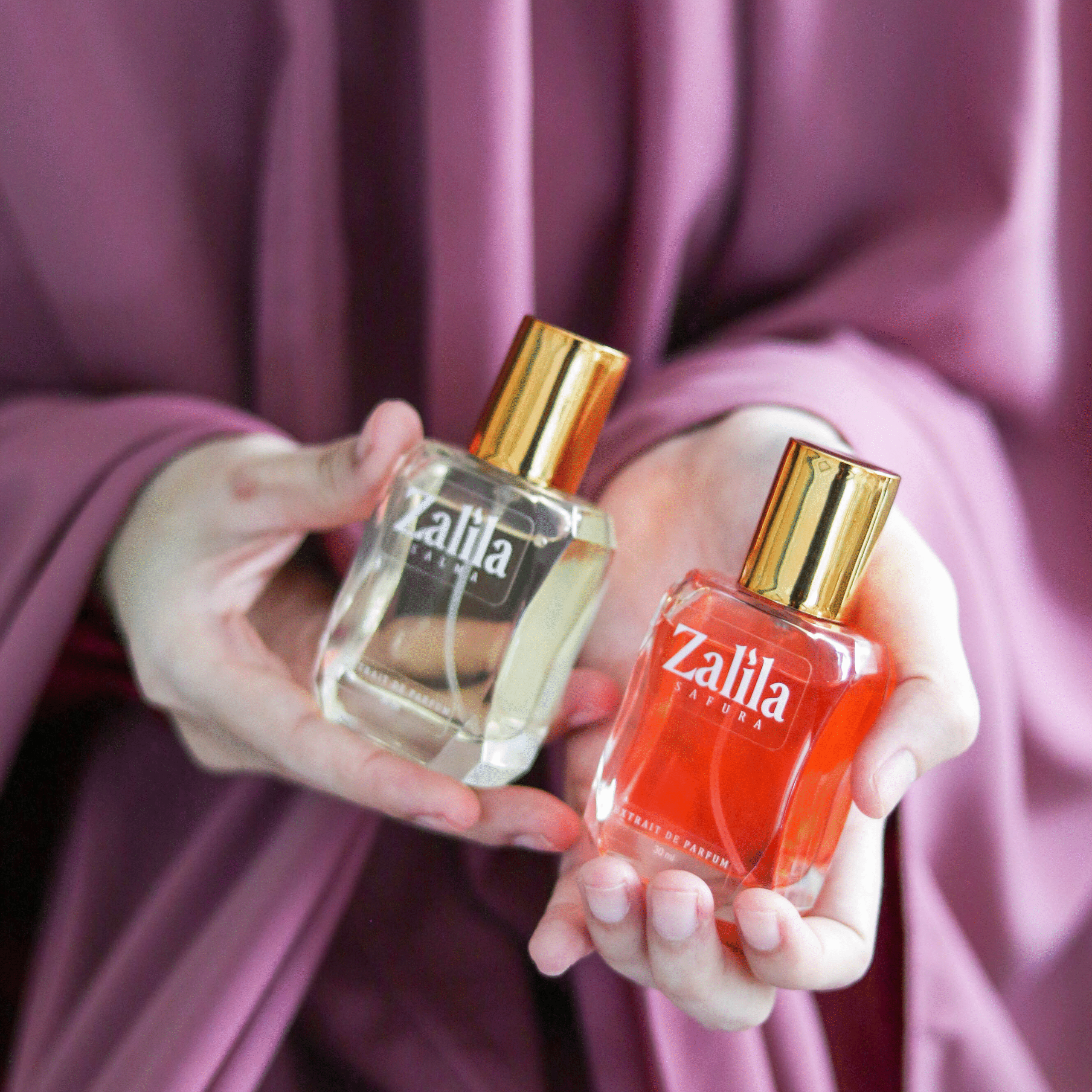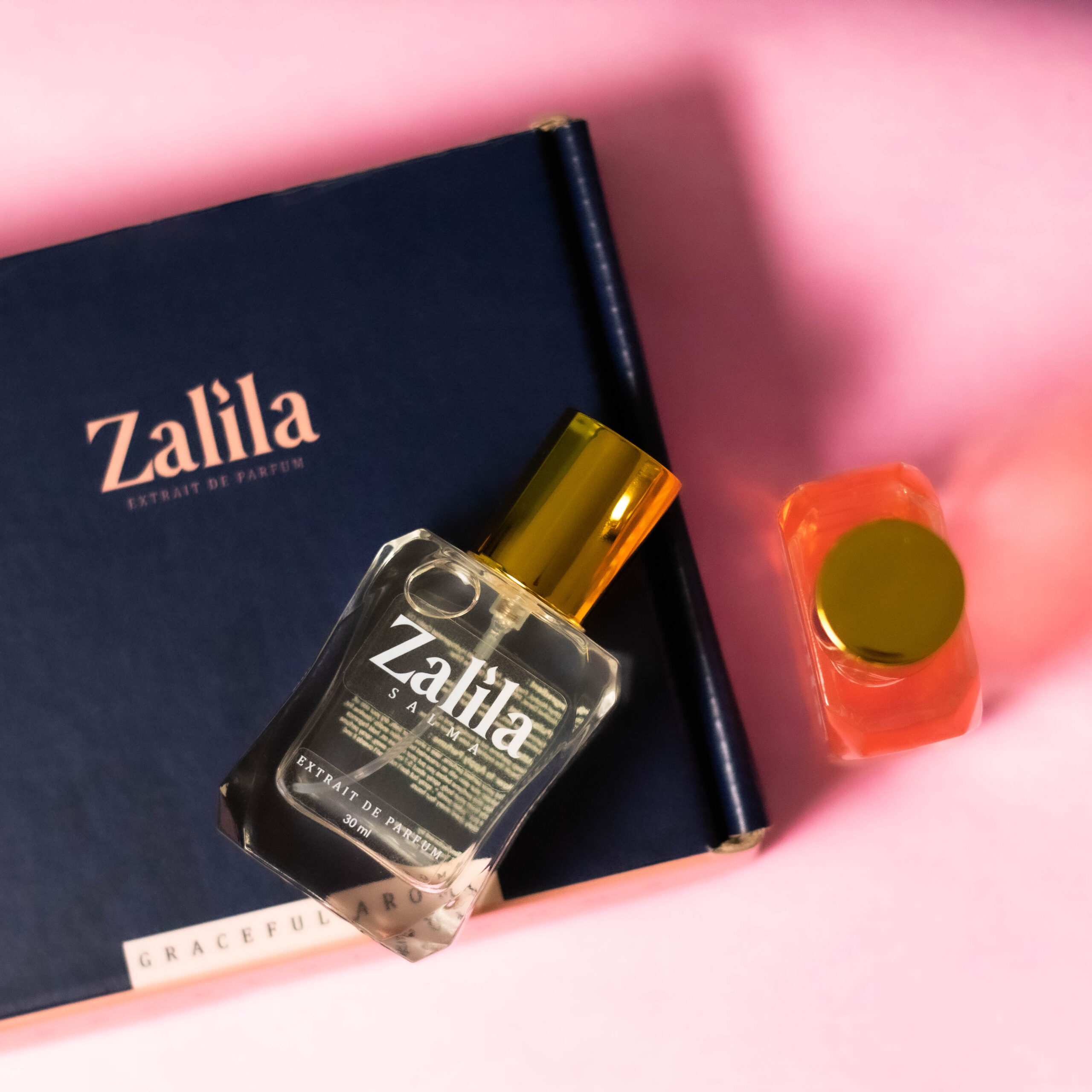 ZALILA PARFUM by Umair hadir dalam 1 box berisi dua varian, Salma (vanila & oud) dan Safura (floral & oriental), keduanya dibuat dari bahan berkualitas dan dikemas dengan desain mewah.
